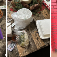 Crispy rice, salad, shredded coconut, chili oil paste, eggs mixed with green onion and cilantro, with sour pork. Topped with crushed peanuts and whole roasted chili.