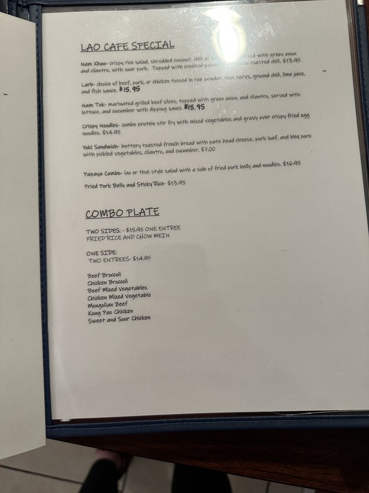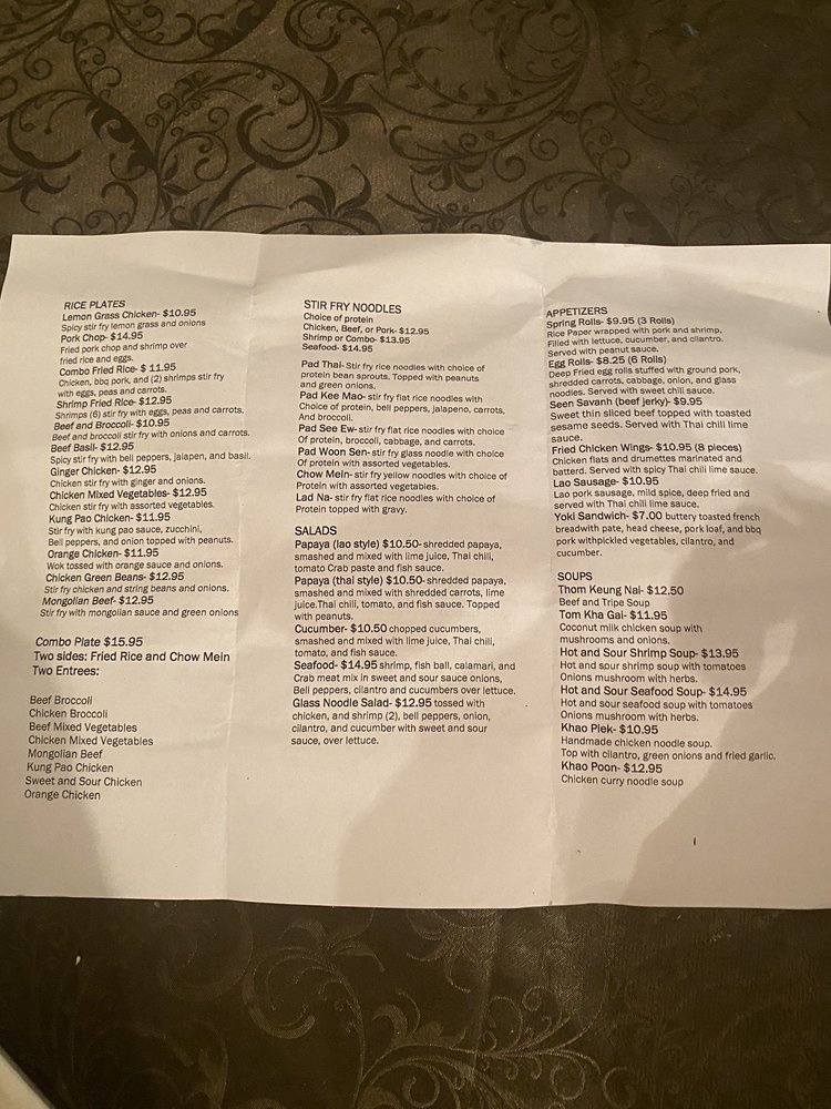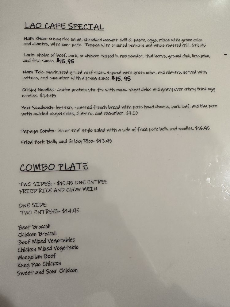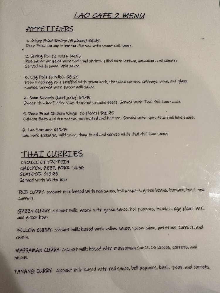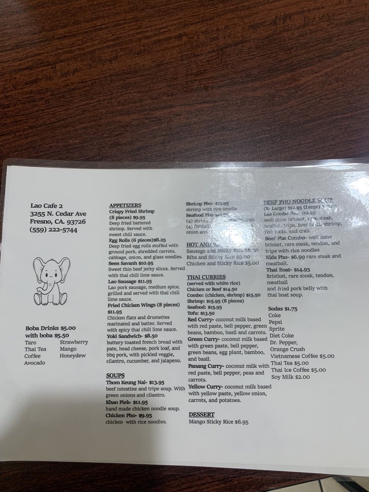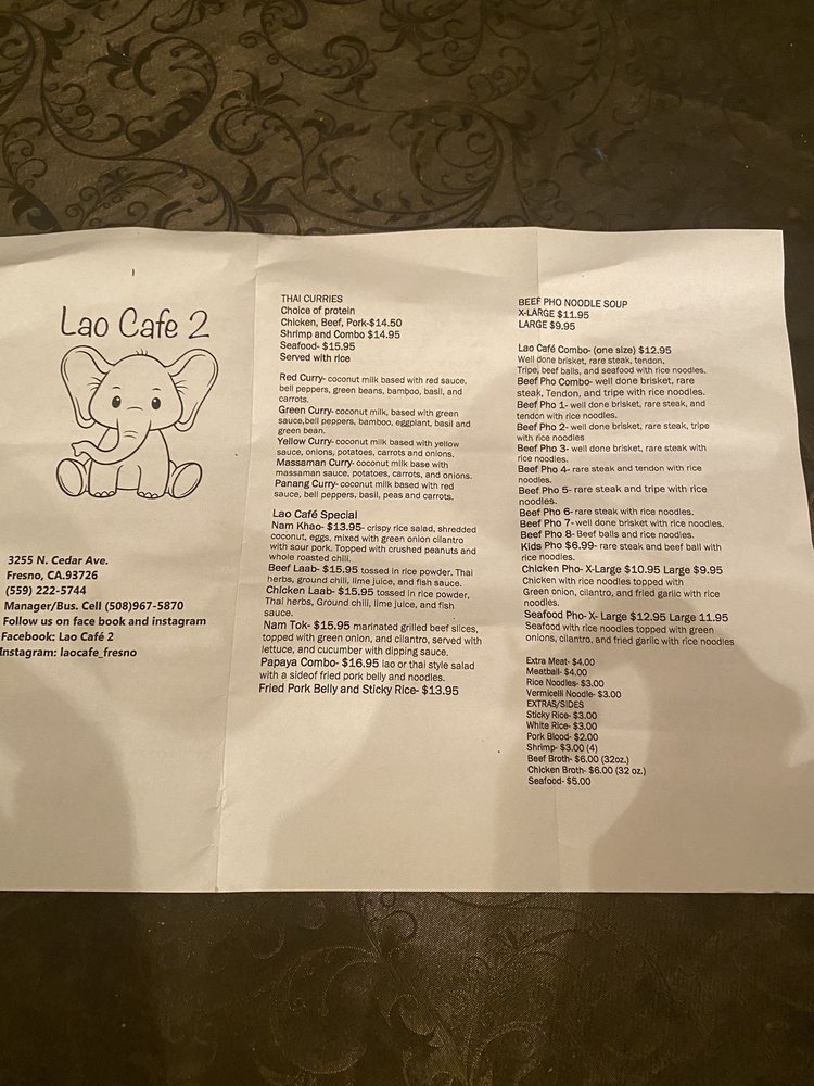 Lao Cafe 2, a Laotian-Thai restaurant located in Fresno, CA, offers a diverse menu with options for all preferences. From their flavorful Beef Pho Noodle Soup variations to mouth-watering appetizers like Shrimp Spring Rolls and Lao Sausage, there is something for everyone to enjoy. Customers rave about the delicious dishes, with highlights including the beef basil and beef laab. Despite being a hole-in-the-wall spot, the service is friendly, and the portions are generous for the price. While some reviews mention minor drawbacks like slow service or less impressive dishes, overall, Lao Cafe 2 is a must-visit for authentic and tasty Lao cuisine in a casual setting. Next time you're in the mood for a flavorful meal with options for vegetarians and meat-lovers alike, consider giving Lao Cafe 2 a try.